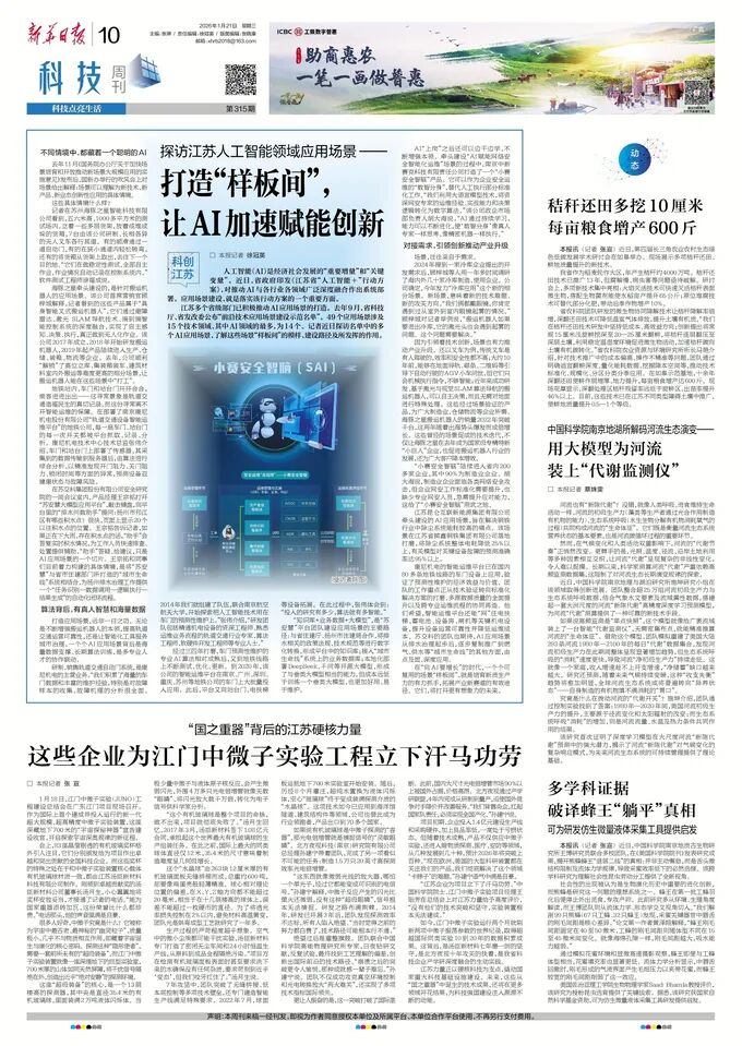 2026年1月21日,《新华日报》以《探访江苏人工智能领域应用场景——打造“样板间”, 让AI加速赋能创新》为题,报道了JIUYOU.COM等入选江苏省“前沿技术应用场景建设示范名单”企业,在应用场景建设方面的实践与成效。